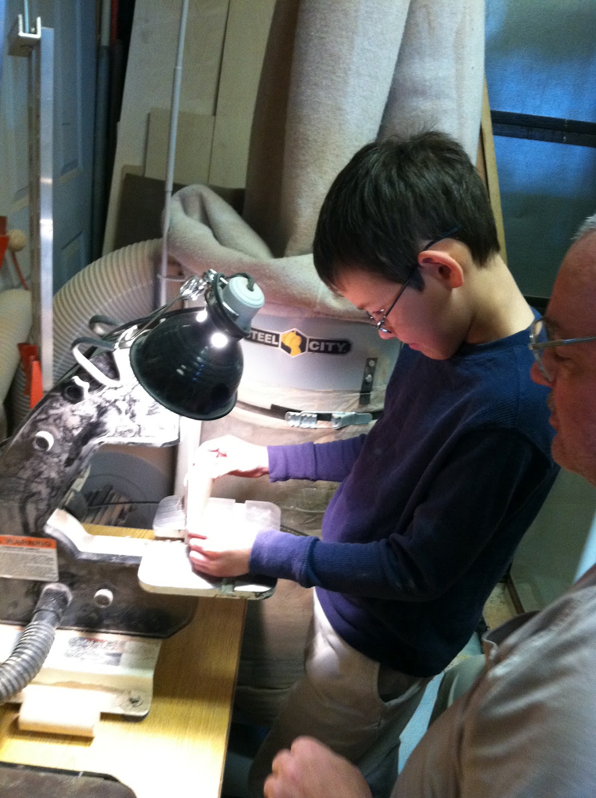 Lincoln making his pinewood derby car with Grandpa Terry. Lincoln even got to use some of the power tools himself!